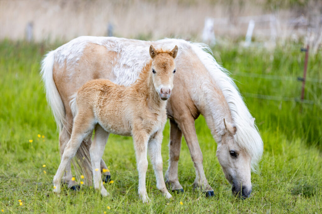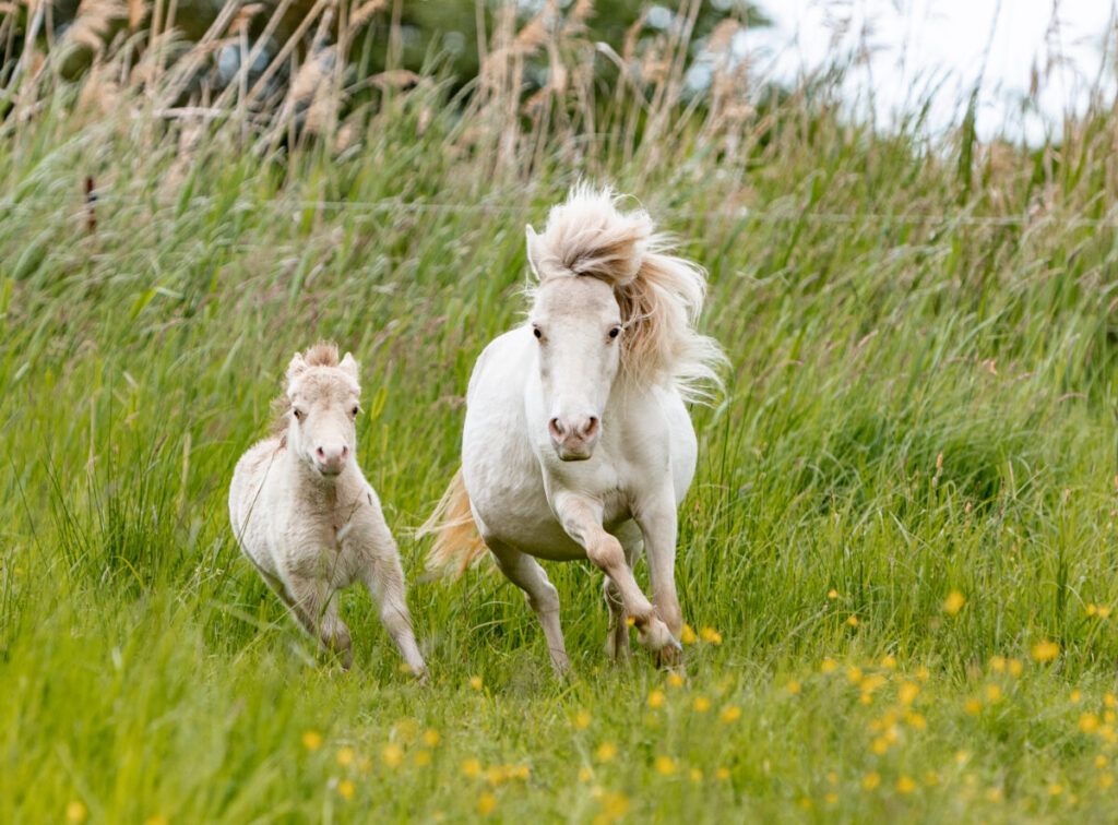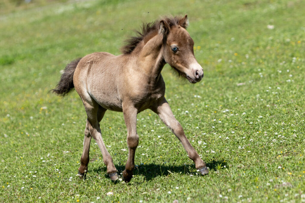 Im Jahr 2025 haben bei uns fünf bezaubernde Fohlen das Licht der Welt erblickt. Mein Junghengst AQM Fantasys A Celtic Dream – zweite Generation AQM und Enkel des unvergessenen Ridgehavens Cocoa – hat vier vielversprechende Fohlen gebracht: aus AQM Fames Lucid Blessing ein wunderbares Gold Champagner Stutfohlen, aus AQM Cocoas First Flower of Autumn ein freches Dun Champagner Hengstfohlen, aus Godts Wild Bluebell ein auffälliges Fuchscheckhengstfohlen und schließlich aus Designers Touch Spakle Brite ein überwältigendes Classic Champagne Hengstfohlen. AQM Celtics Roses of Red, AQM Celtics Key to my Heart, AQM Celtics Under A Violet Moon und AQM Celtics Lux Solaris sind alle auf ihre Weise sehr gelungen. Eine Überraschung hielt Premiers Special Blessing für uns parat, als sie am 2. Juli ein Dunalino Hengstfohlen von Los Arboles Idols Claim To Fame zur Welt brachte. Wer mitgezählt hat, hat gemerkt: die Jungs sind mal wieder in der Überzahl und ärgern die kleine “Rosie” manchmal ganz schön, wenn sie wild über die Wiesen flitzen.