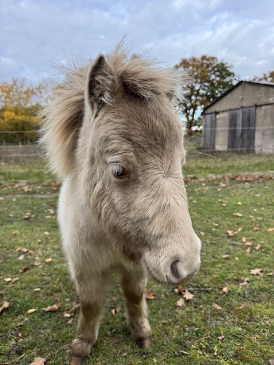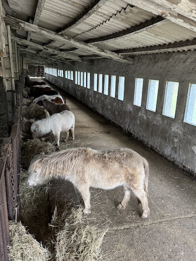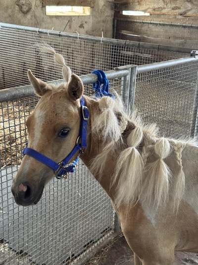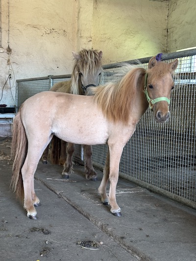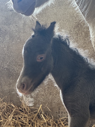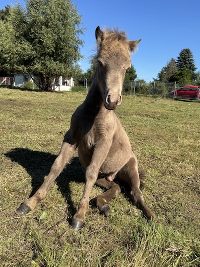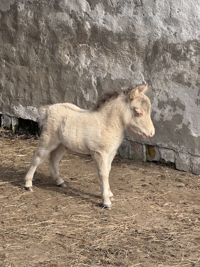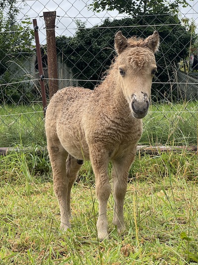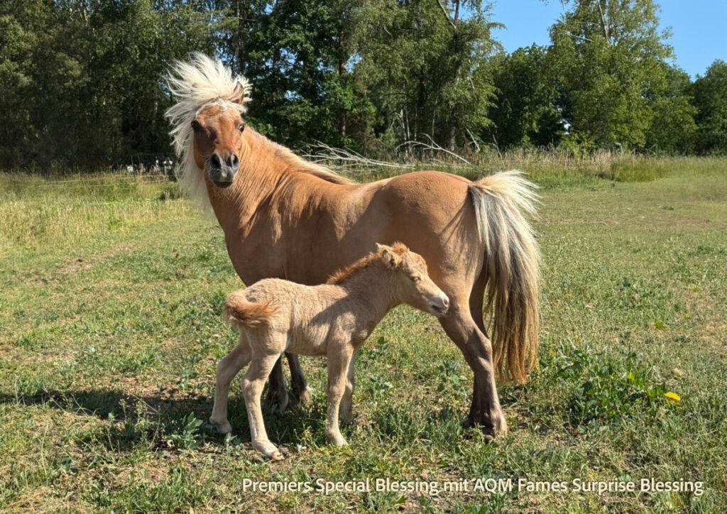 Für eine Überraschung sorgte dann noch Blessing. Die hatte den Winter 24/25 bei Bekannten verbracht, die dringend ein Beistellerpony brauchten für ihre Ministute, deren Freundin im Herbst gestorben war. So wurde Blessing nicht per Ultraschall untersucht. Da sie aber schon mehrere Jahre nicht mehr aufgenommen hatte, hatte ich nicht erwartet, dass sie trächtig sein könnte. Als sie im späten Frühling 2025 zurückkam, war es schon nicht mehr zu übersehen: In diesem kullerrunden Bauch ist das einzige Fame Fohlen von diesem Jahr. AQM Fames Surprise Blessing wurde am 2. Juli geboren: Hengstfohlen Nummer vier machte damit den Jahrgang komplett. Blessing und Fame haben ja jede Menge Farbgene in den Mix zu werfen und bislang sehen die vier Nachkommen der Beiden alle farblich völlig unterschiedlich aus. Surprise ist ein Dunalino geworden, ein Palomino mit Falbgen, also mit Aalstrich. Die Zukunft wird zeigen, ob er auch die Zebrastreifen seiner Mutter geerbt hat.