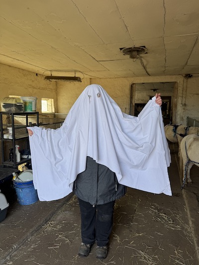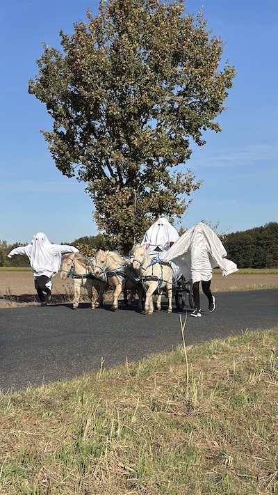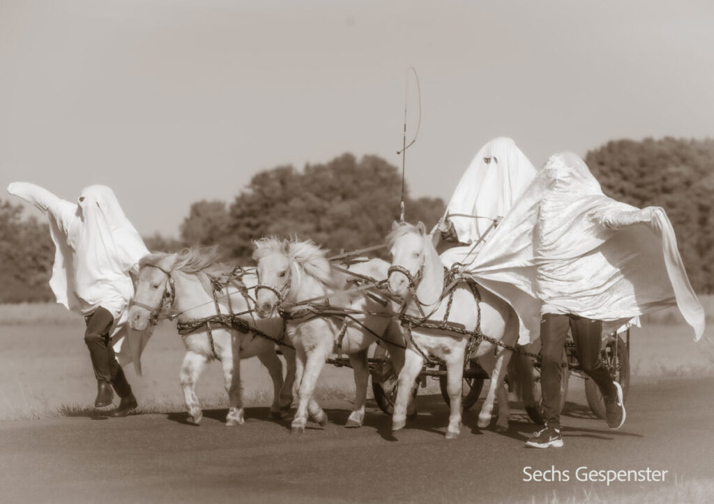 Da Julia ein Showbild mit dem Titel Ghostbusters geplant hatte, galt es als erstes, die Pferde an Gespenster zu gewöhnen. Also lief ich, zur Erheiterung der anwesenden Zweibeiner, mit einem Bettlaken über die Koppel. Ich verteilte dabei Leckerli und stellte fest: vor weißen Tüchern fürchten sich meine Pferde gar nicht. Wir haben dann noch die Gelegenheit genutzt, ein Gespenster-Fotoshooting zu machen. Wer meine Halloween-Bilder gesehen hat, weiß jetzt, wie und warum sie entstanden sind.