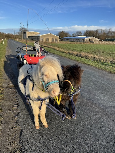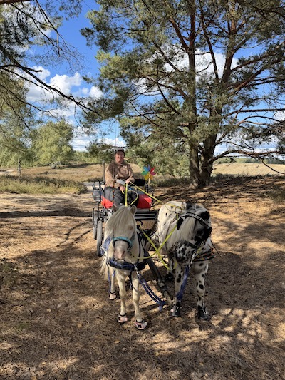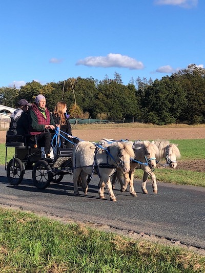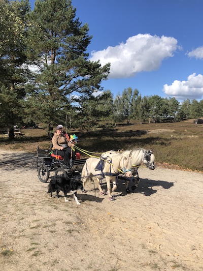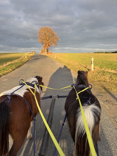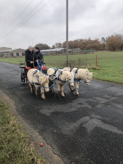 Im September kam Alex mich noch mal für zwei Wochen besuchen. Eigentlich hatte ich wegfahren wollen, aber ein krankes Pferd und der Gartenstress (siehe Unterpunkt Garten) hielten mich zu Hause fest. Rückblickend war das nicht so schlimm, denn wir machten uns zwei herrliche Urlaubswochen zu Hause. Alex hatte ihr Punktepony Stippels mitgebracht und er verstand sich sofort blendend mit meinen Jungs. Obwohl sie von der Größe her eigentlich gar nicht zusammen passen, haben wir Stippels mit meinen Pferdchen zusammen angespannt. Antonin und Magic sind jeweils mit Stippels zweispännig gegangen und weil das so gut klappte, haben wir sie schließlich als Troika angespannt.