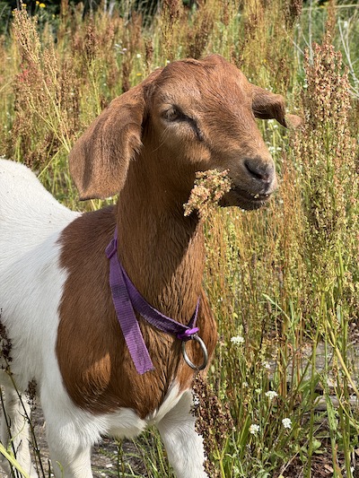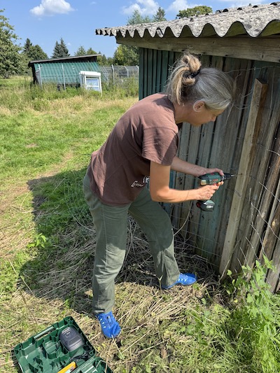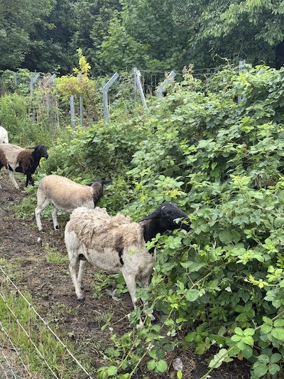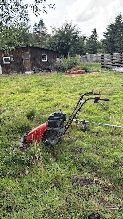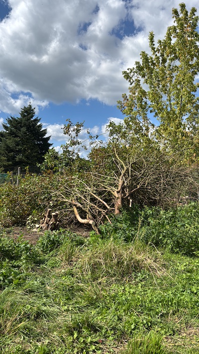 Schon im Jahr 2024 hatte ich die Gelegenheit bekommen, meine Pferde auf eine Fläche in einer Kleingartenanlage zu stellen. Die Vorteile liegen auf der Hand: ringsum sicher eingezäunt, keine Wölfe (zwei- und vierbeinige!) weit und breit, und die Gärten sind nur etwa 2km von meiner Wohnung entfernt. Die alte LPG Anlage, auf der meine Pferde seit vielen Jahren wohnen, ist 5km entfernt. Für das Jahr 2025 bot mir dann die Besitzerin der Gärten an, noch weitere, komplett zugewachsene und verwilderte Flächen dazuzunehmen. Ich sagte zu und stellte zunächst meine Wiederkäuer in den Urwald. Die sieben Schafe machten sich sogleich ans Werk und schnell wurden noch zwei Burenziegen angeschafft, um der Wildnis Herr zu werden.