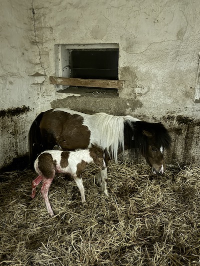 Das zweite Fohlen kam schon eine Woche später am 7. April. Zum ersten Mal in 15 Zuchtjahren hatte ich eine wirkliche Fehllage bei einem Fohlen. Zwar hatte ich schon Vorderbeine, die nicht perfekt gestreckt waren, oder Köpfe, die man ein bisschen nach unten drücken musste, aber nichts wirklich Dramatisches. Von Floras diesjährigem Hengstfohlen hingegen kam ein Bein und sonst nichts. Die Lehre daraus ist, dass man sich nicht darauf ausruhen darf, wenn eine Stute schon drei Geburten ohne Probleme gemeistert hat. Es macht immer Sinn, die Stuten gut zu überwachen und im Zweifelsfall dabei zu sein, um eingreifen zu können. Nur deshalb haben wir den kleinen Kerl und seine Mutter retten können.