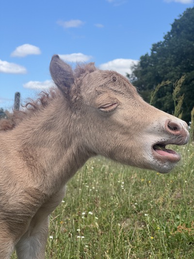 Egal, wie aufmerksam man die Kamera im Blick behält – es gibt immer Stuten, die genau in dem kurzen Moment, in dem niemand hinschaut, ihr Fohlen zur Welt bringen. Und so kam es, dass ich in der Nacht vom 12. Juni auf die Kamera sah und dachte: Da im Stroh, da rührt sich was! Soleil hatte eine kleine Kopie ihres 2023 Fohlens Willow geboren: Lange Beine, einen traumhaften Hals und natürlich champagner. Schließlich ist Soleil reinerbig für das begehrte Farbgen. Leider ist AQM Celtics Lux Solaris, genannt Lux, nicht reinerbig für Champagner geworden, wie ich es insgeheim gehofft hatte – schließlich tragen beide Eltern dieses Gen. Dennoch hat er in jeder anderen Hinsicht alle Erwartungen mehr als übertroffen. Deshalb wird er auch erst einmal hier in der Aufzucht bleiben.