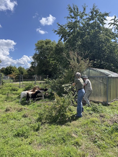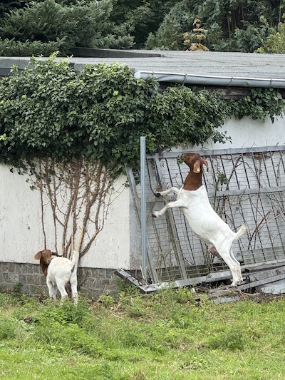 Die Schafe und Ziegen verbrachten nicht nur einen sehr fröhlichen Sommer dort, sondern sie leisteten auch ganze Arbeit. In kürzester Zeit fraßen sie Hopfen (der wächst bei uns in riesigen Mengen), Buschwerk, Sträucher und kleinere Bäume restlos weg bzw. kahl. Dabei fanden sie in den verwilderten Teilen der Gärten auch die Löcher in den Zäunen und machten mich auch sogleich darauf aufmerksam, indem sie in die Nachbargärten abwanderten, um dort weiterzufressen.