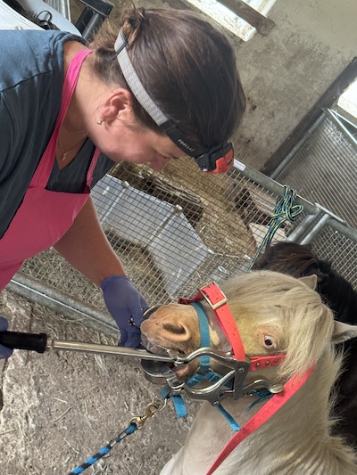 Natürlich war auch unsere Dentistin Kate Mezerova aus Tschechien wieder bei uns. Hier gab es rundum Lob und keine größeren Probleme. Brownie wurden zwei Wolfszähne gezogen und einige Pferde hatten Ecken und Kanten, die geraspelt werden mussten. Viele meiner Pferde sind mittlerweile in einem Zweijahreszyklus, was das Zähne raspeln betrifft. Gerade bei den kleinen Köpfen der Minis ist es mir aber wichtig, dass Kate jedes Jahr eine Kontrolle macht. So kann man entstehende Probleme zeitnah angehen und beheben.