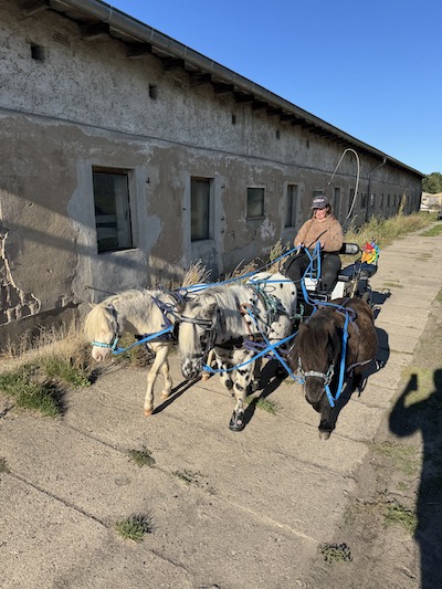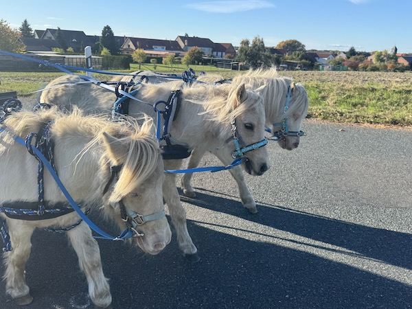 Zum ersten Mal seit vielen Jahren waren Alex und ich 2025 nicht auf der Sternfahrt der Ponyzuchtgemeinschaft Drömling dabei. Penny war ja quasi direkt nach der Distanzfahrt zu Fame auf die Wiese gezogen (und auch prompt bei der ersten Bedeckung tragend geworden und rollt seither durch die Gegend). Durch andere Umstände (siehe Punkt: Garten) war niemand fit genug für 25km. Da aber Alex das Wochenende nun einmal frei hatte, spannten wir in den Tagen das erste Mal den Dreispänner an. Wir hatten ja schon im September mit Antonin, Magic und Stippels geübt. Jetzt spannten wir Magic, Flora und Famina, an. Diese Entscheidung erwies sich in mehr als einer Hinsicht als Glücksgriff: Denn Julia Steinbrecher wurde auf den Dreispänner aufmerksam und lud uns spontan ein, Teil ihres Showbildes auf der Passion Pferd zu sein. Und so kam ich zu meinem wohl größten Abenteuer in diesem Jahr: die Passion Pferd.