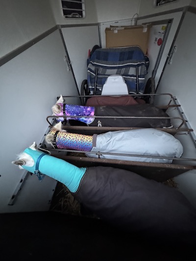 Größere Sachen waren natürlich die Schwergeburt von Flora, die wir zum Glück gut in den Griff bekommen haben. Carrie hat uns einige Rätsel aufgegeben mit seltsamen und nicht zusammen passenden Symptomen: Steifheit und Lungenödem. Zum Glück ist auch sie wieder gut auf dem Damm. Sie bekommt im Moment etwas Einzelbetreuung mit Box in der Nacht, Zusatzfutter für die Atmung von Alpurial und einfach ein bisschen von dem, was die Engländer TLC (tender loving care) nennen. So fühlt sie sich aktuell ganz gut.