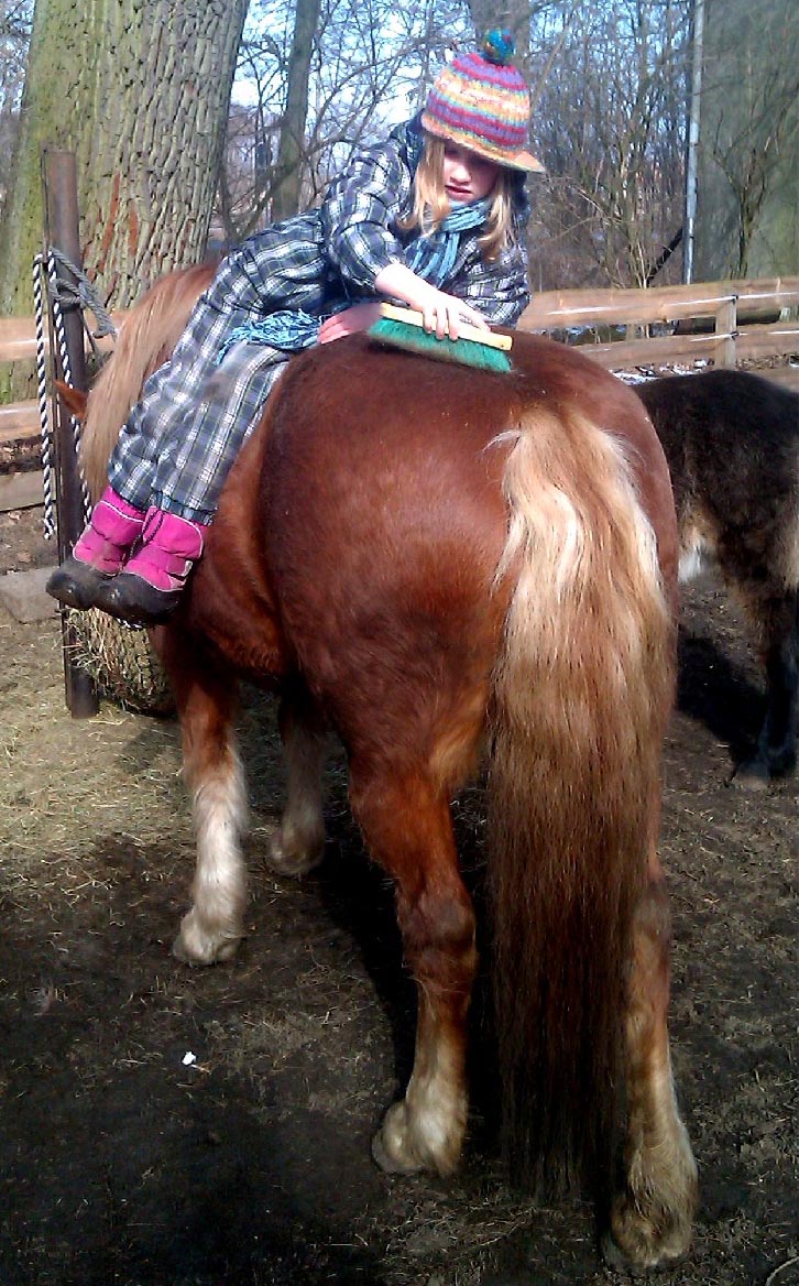 Frenzi war lange Zeit das Herz meines Teams. Sie ist eine Haflingerstute von 1,45m Stockmaß und konnte beinahe alles. Sie war Voltigierpferd, Reitpferd, Kutschpferd, wenn nötig Leinwand, Träger von Blumenschmuck und bunten Bändern in der Mähne, Hauptperson in Indianer- und Cowboy-Spielen, Märchenpferd für Kleinmädchenträume und noch vieles mehr. Mittlerweile genießt sie ihren wohlverdienten Ruhestand mit großen Mengen Heucobs und Zuckerrübenschnitzeln, denn seit sie die 30 erreicht hat, hat sie keine Zähne mehr und kann ihr Futter nur noch schlürfen.